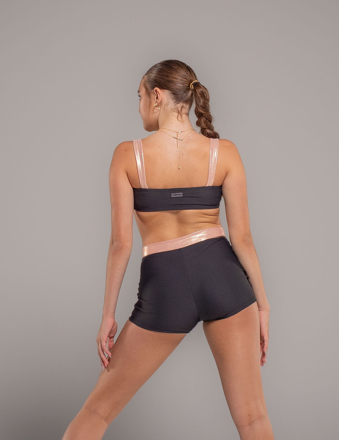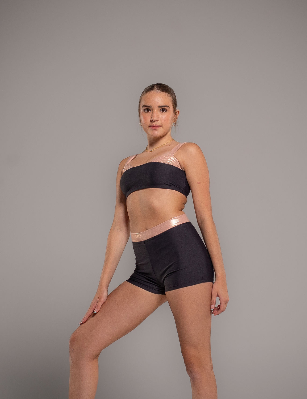 Designed to match the power and polish of The Platinum Top, The Platinum Short features a sleek high-waist silhouette accented with a bold metallic combo waistband. The 1.25” waistband height adds a refined, fashion-forward edge while providing a secure, flattering fit. Finished with a 2” inseam, this short balances confidence and comfort, making it perfect for performance, practice, or standout styling beyond the stage.
